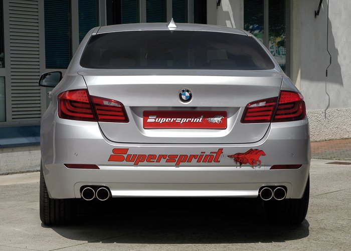 La marca Supersprint lanza al mercado un escape fabricado completamente en acero inoxidable y homologado para la ITV, para darle un look espectacular a la ultima generación del serie 5. El escape tiene 4 salidas de 80mm de diámetro circulares (dos a cada lado). Esta disponible para la versión 525 diésel y 530 diésel.